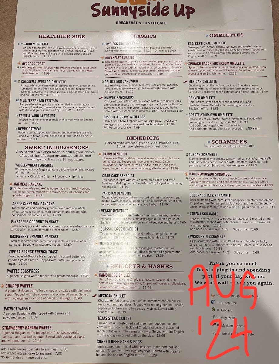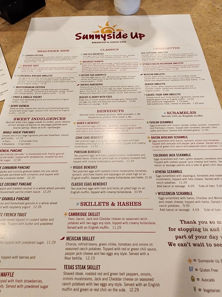 The menu at Sunnyside Up is a vibrant tapestry of flavors, offering a range of dishes that celebrate the joy of breakfast. Whether you opt for the Garden Frittata, a luxurious open-faced omelette brimming with fresh greens and savory roasted mushrooms, or the beloved Avocado Toast — with its creamy avocado and perfectly cooked eggs — your taste buds are in for a treat. The Cambridge Skillet, layered with ham, bacon, and topped with creamy hollandaise, is not just a dish; it’s an experience to savor. Similarly, the Mexican Skillet brings the zest of chorizo and green chiles, ensuring every bite is packed with excitement.